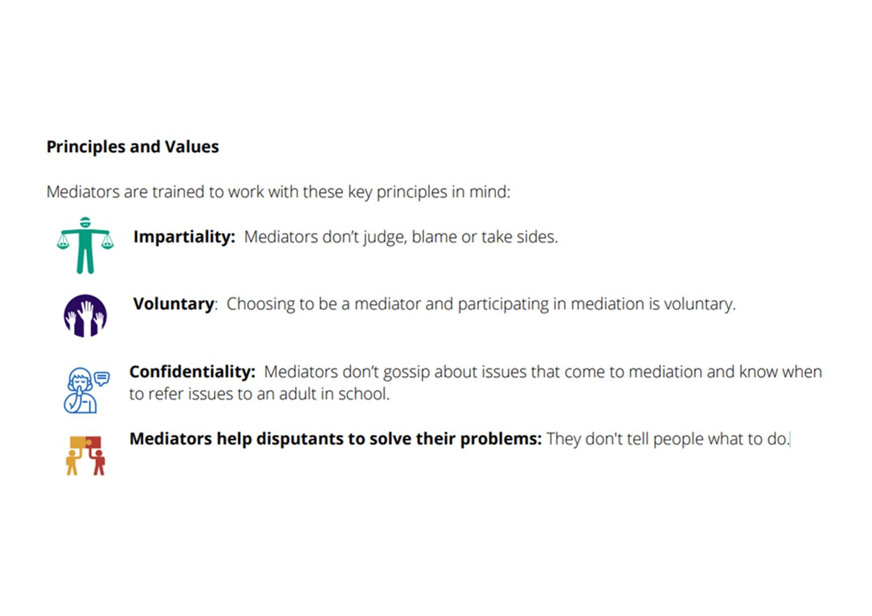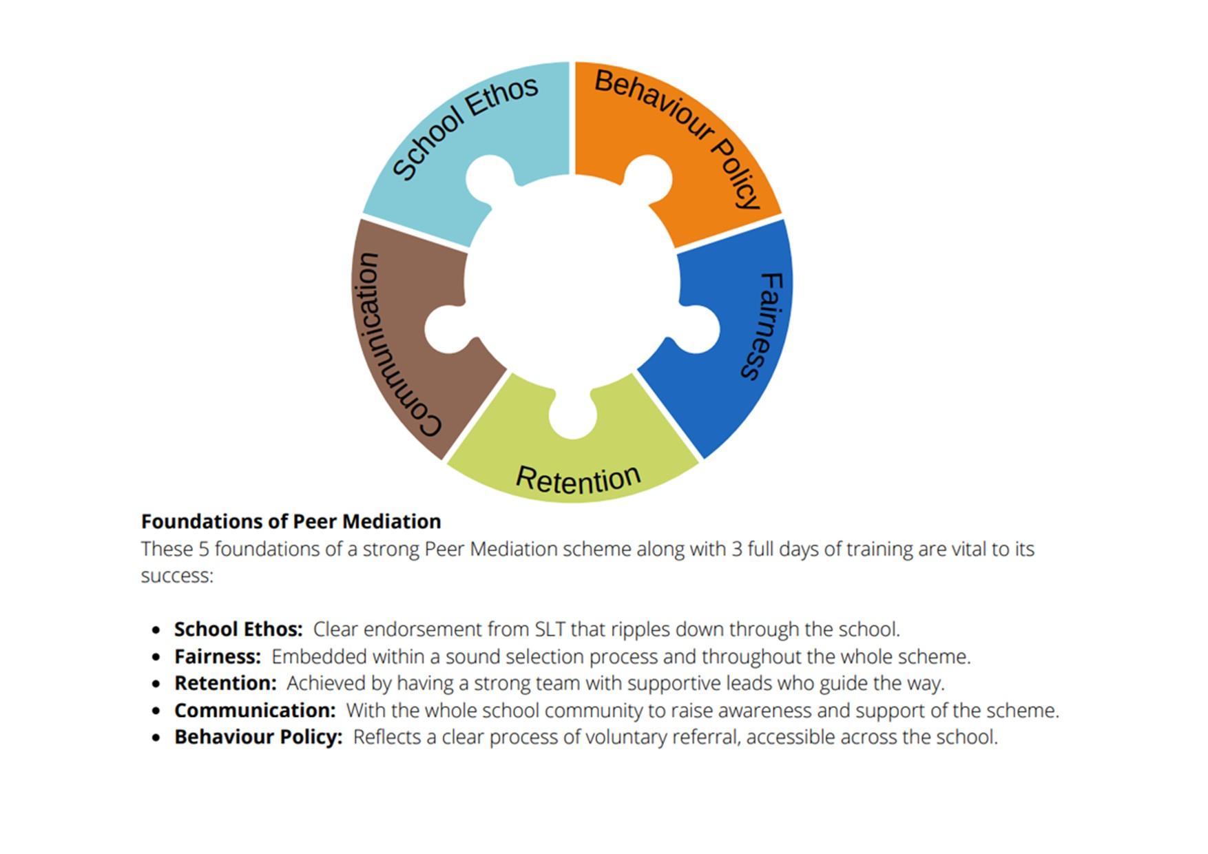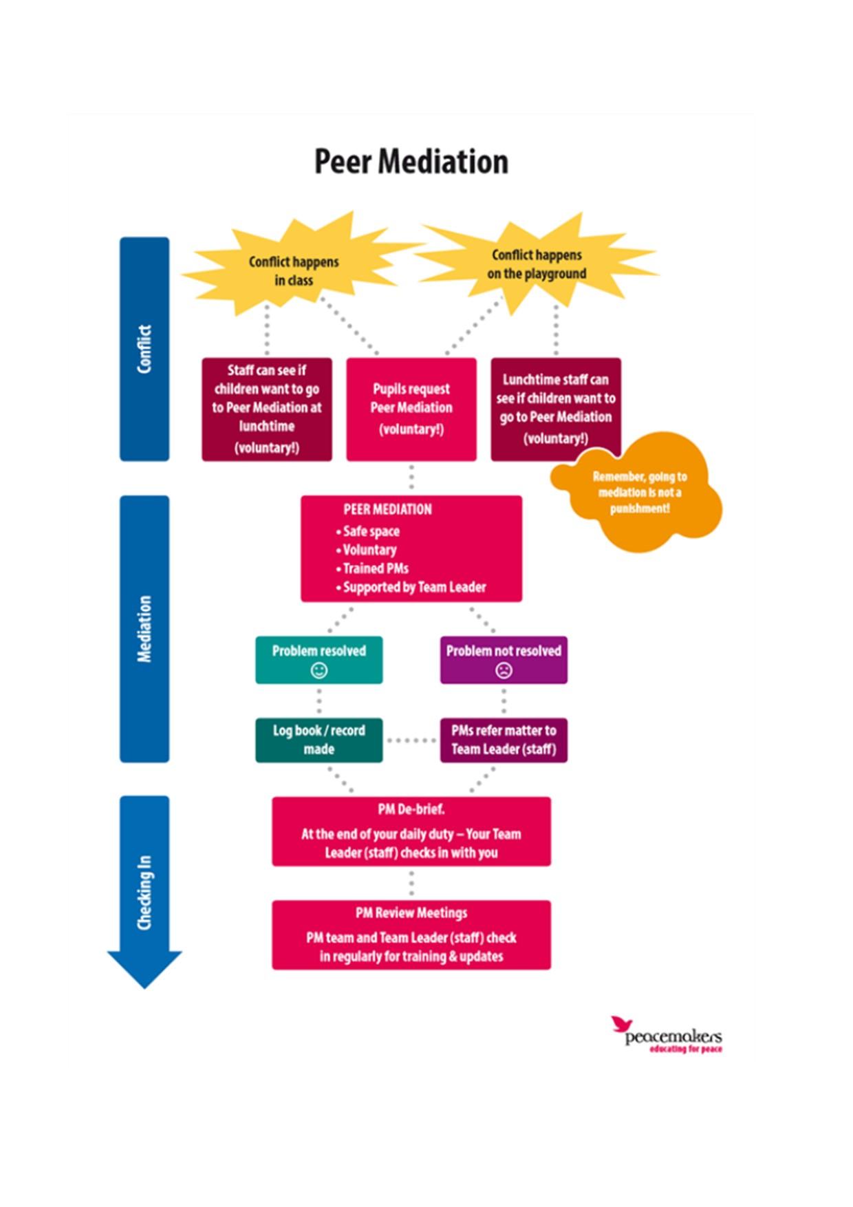 Peer Mediation is a process where two trained mediators help two other children, who are engaged in a dispute, to find their way to an agreeable solution. It is different from Buddying or Mentoring schemes but can operate alongside such initiatives in schools. Mediators are trained to recognise bullying, and although they cannot mediate such incidents, they will refer them to the Mediation Lead.