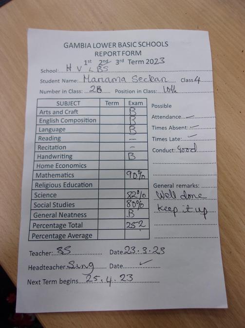 Over the last few years, we have sponsored a young lady called ‘Khaddijatou Leigh’. The money that we have been raising through penny Monday’s has helped Khaddjiatou with her education as well as providing meals for her every day. She has now left the school and village therefore we will now be sponsoring a new student called ‘Mariam Seckan’. Each term, the school keeps in contact with us by providing us with report cards.