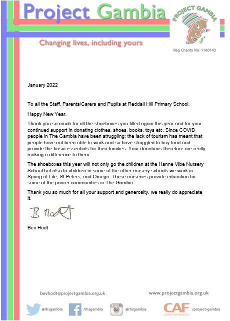 Bev, who is the founder of Project Gambia has written the school a thank you letter but I am sure everyone in our school community would also like to thank her for all her support in running the activities and helping us to establish the international link with The Gambia!