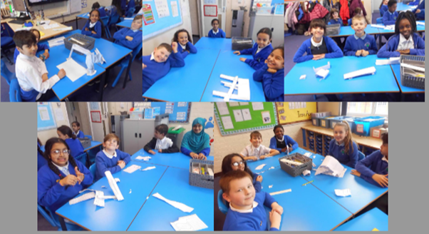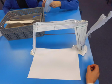 Year 5 worked in teams to build a bridge out of paper and tape which can hold as much weight as possible.