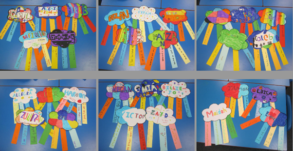 We created rainbow clouds all about us! We used our name in the cloud and wrote down brilliant adjectives that describe us!