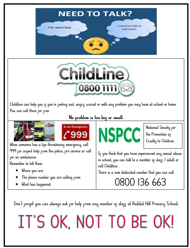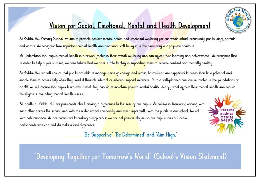 We have a super team of Staff Wellbeing Champions, who have completed a psychological first aid training course. They are available to support pupils, parents and staff with their emotional and mental wellbeing. They can also direct you to the most appropriate form of support beyond Reddal Hill, if necessary. We are here to help and support if you need us!