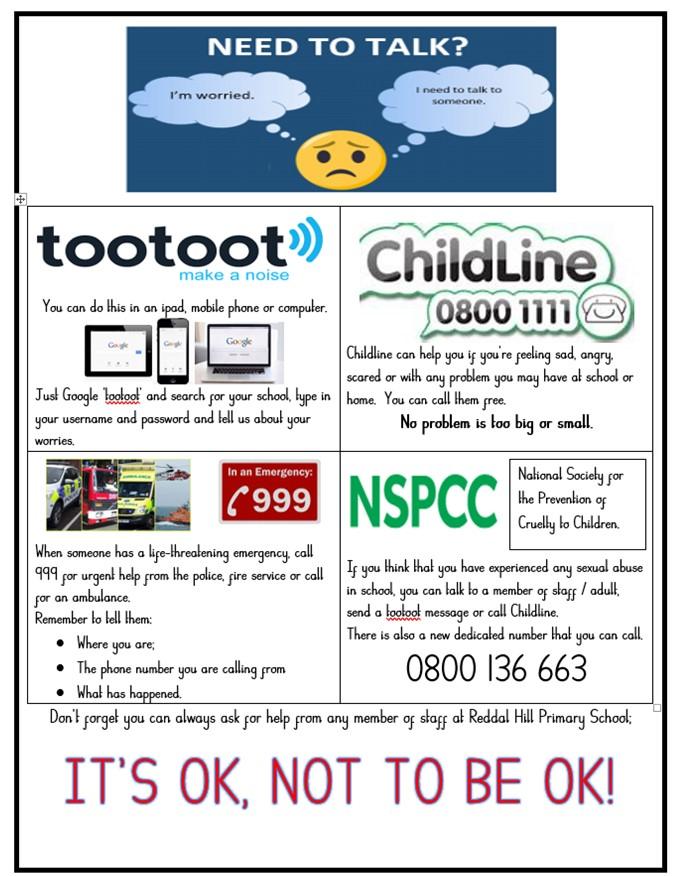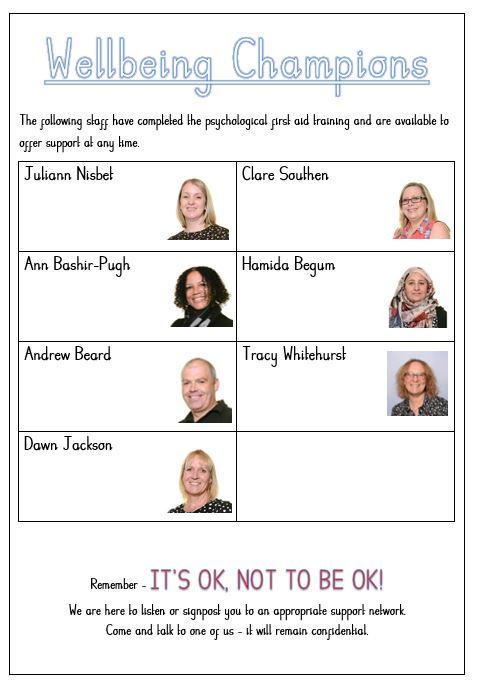 We have a super team of Staff Wellbeing Champions, who have completed a psychological first aid training course. They are available to support pupils, parents and staff with their emotional and mental wellbeing. They can also direct you to the most appropriate form of support beyond Reddal Hill, if necessary. We are here to help and support if you need us!