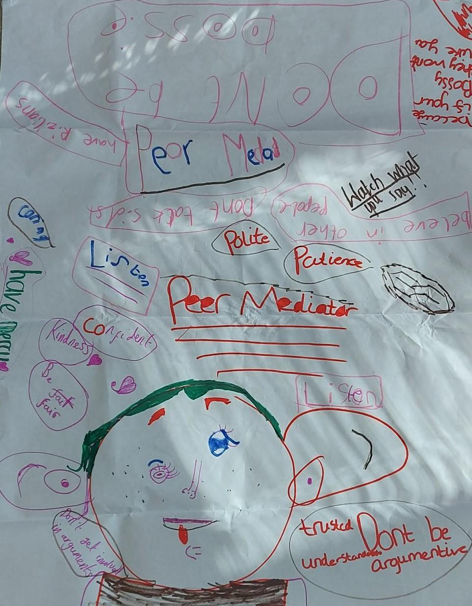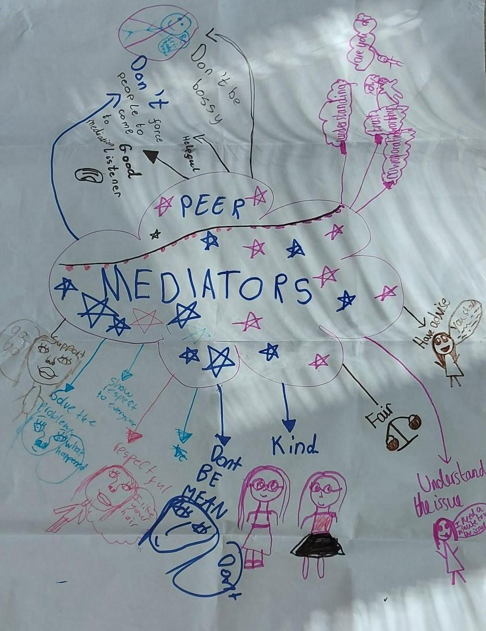 Peer Mediation is a process where two trained mediators help two other children, who are engaged in a dispute, to find their way to an agreeable solution. It is different from Buddying or Mentoring schemes but can operate alongside such initiatives in schools. Mediators are trained to recognise bullying, and although they cannot mediate such incidents, they will refer them to the Mediation Lead.