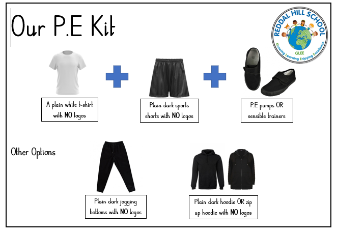 Please bring the appropriate P.E kit into school in their school P.E. bag. This will stay in school and be sent home each half-term to be washed. The children should wear a plain white/blue T-shirt, black jogging bottoms or leggings or black shorts in appropriate weather and black P.E pumps or plain black trainers.