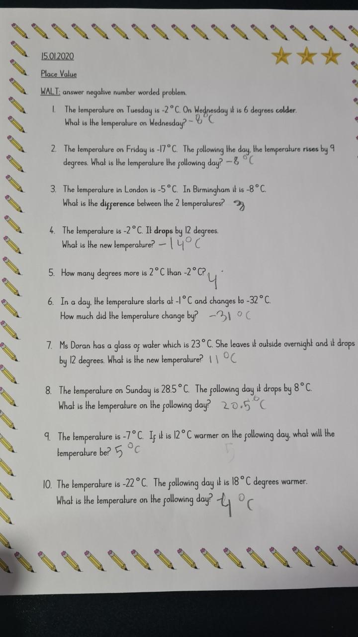 James has been working super hard this week. Here is an example of some great 'negative numbers' work in Maths.