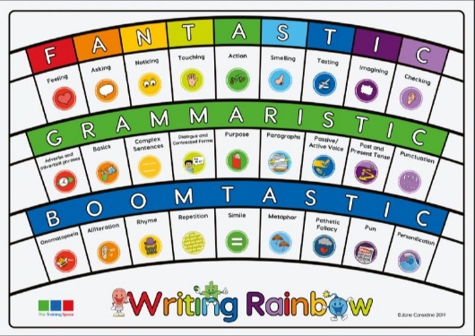 In The Write Stuff approach to writing, children explore high quality, rich vocabulary and are taught grammar in context through different writing lenses on the Writing Rainbow. There are three lenses used to support children with their writing: