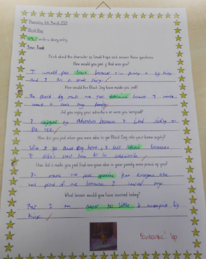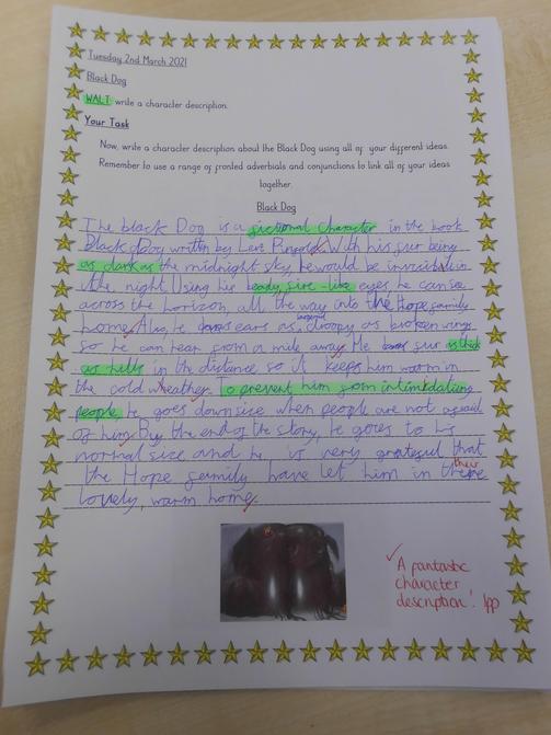 Throughout the week, we completed some work on speech punctuation, wrote a character description of Black Dog, produced a setting description for the playground in the story, wrote a diary entry from the point of view of Small Hope and created a thank you letter back to the Hope family from Black Dog.